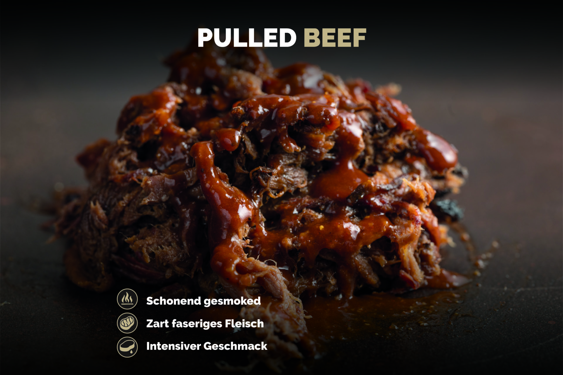 Diese langsame Zubereitung löst Bindegewebe, erhält Saftigkeit und sorgt für das typische, tief-rauchige Aroma. Dafür wird nur besonders hochwertiges Fleisch mit idealer Marmorierung verwendet – sorgfältig ausgewählt und handwerklich verarbeitet.