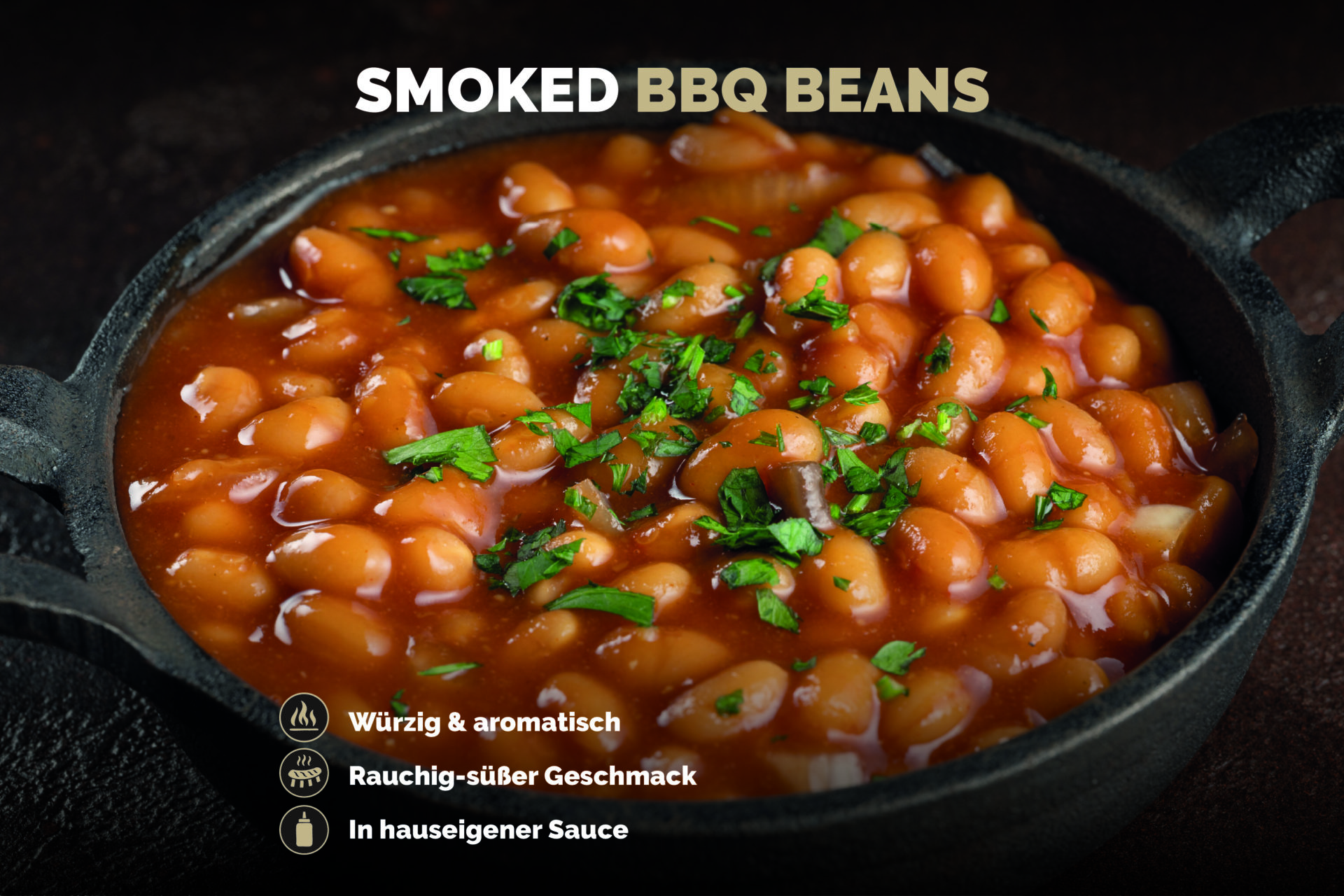Ausgewählte weiße Bohnen, hochwertiger Speck, eine ausbalancierte Gewürz- und Saucenrezeptur sowie achtsame Zubereitung garantieren konstante Spitzenqualität. Smoked BBQ Beans, die jedes Grillevent authentisch machen.