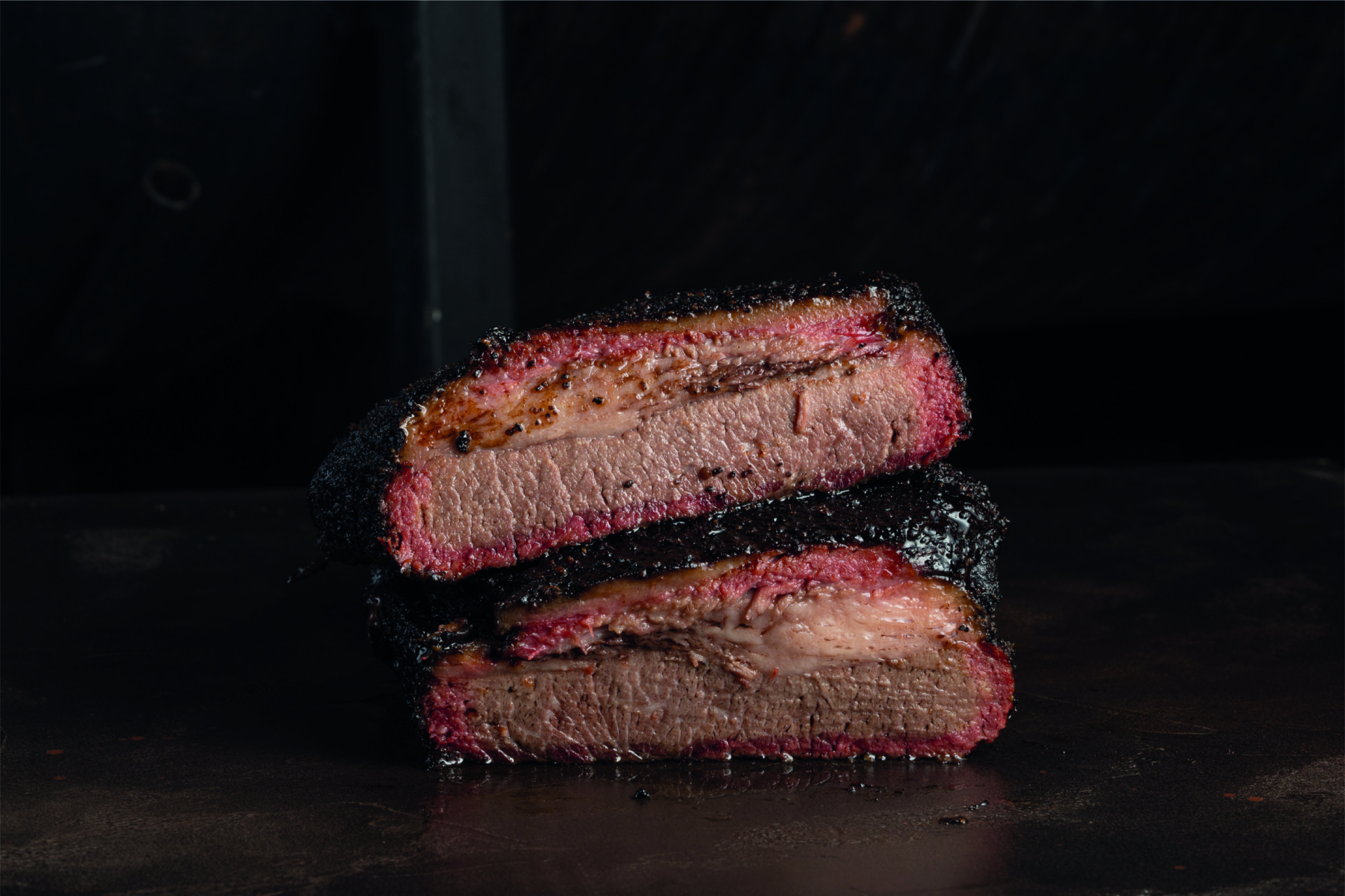 Wir arbeiten mit ausgewählter Black-Angus-Rinderbrust von Creekstone Farms (USA) – präzise Zucht, verantwortungsvolle Haltung und erstklassige intramuskuläre Marmorierung für Saftigkeit, Eigengeschmack und butterzarte Textur. Jedes Bruststück wird von Hand getrimmt, mit unserem Rub gewürzt und stundenlang über Eichenholz low & slow gesmoked, bis es zart geworden ist. Kein Hokuspokus, nur ehrliches Handwerk auf konstantem Pitmaster-Niveau.